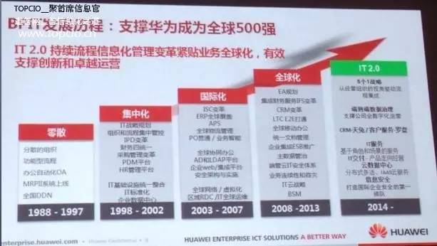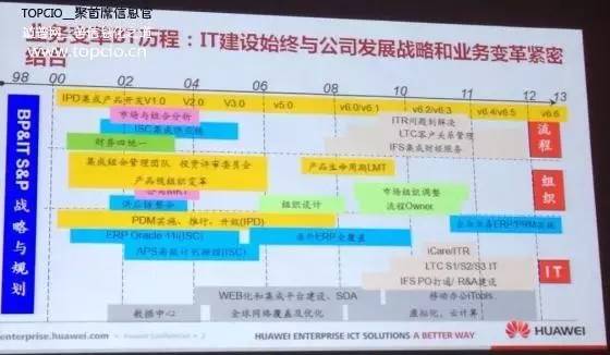華為在做業務變革的時候,關心的是把重要的事情做好,所以質量要求特別高,但是進度不是那么重要。同時,IT建設必須與公司發展戰略和業務轉型緊密結合,IT不能單打獨斗。