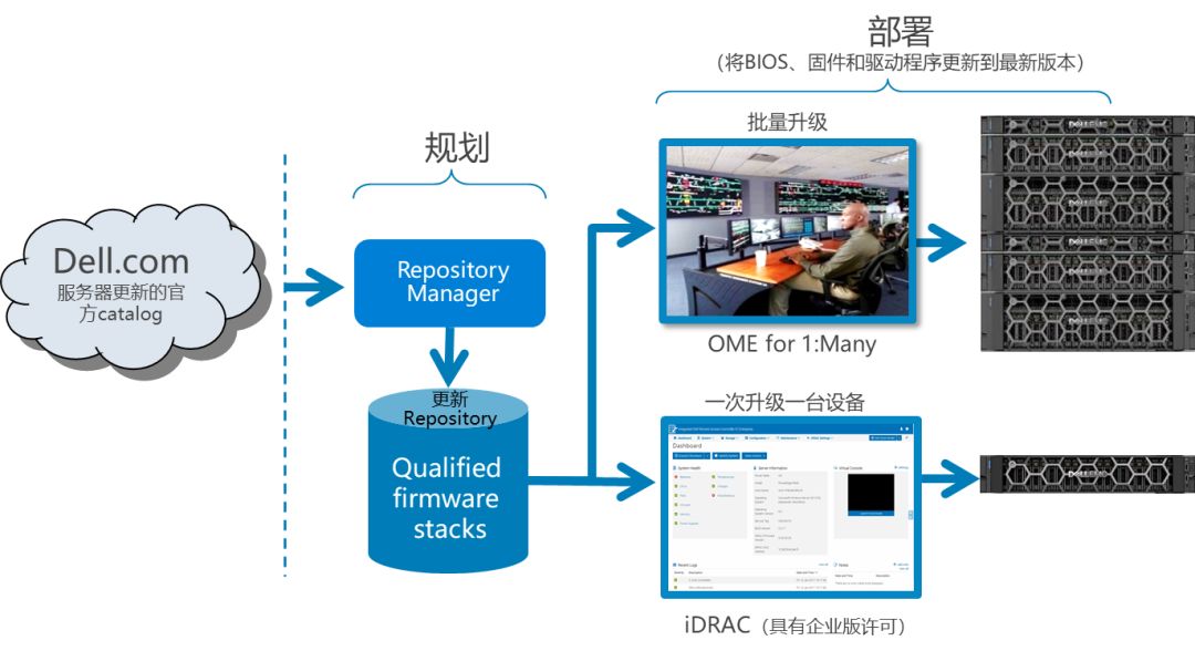 建議使用 Dell (DRM) 創建存儲庫并將 iDRAC 配置為使用此存儲庫檢查和執行固件更新。通過內部存儲庫,用戶可以控制 iDRAC 的可用固件和版本,有助于避免任何意外的固件更改,而 OME 控制臺支持批量固件升級。