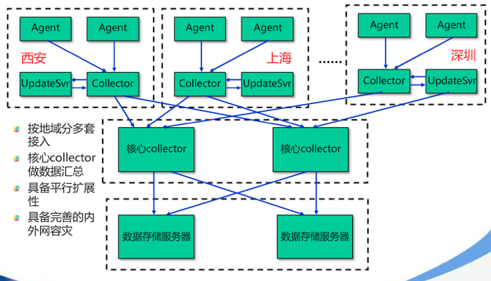 智云主機監控技術的技術架構如下圖所示,支持10W設備主機性能數據采集,為騰訊社交業務提供精準高效的基礎監控能力。